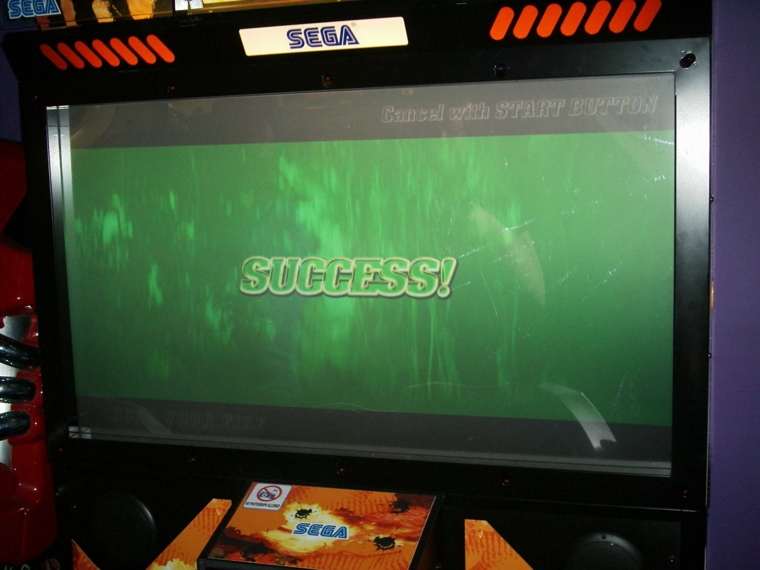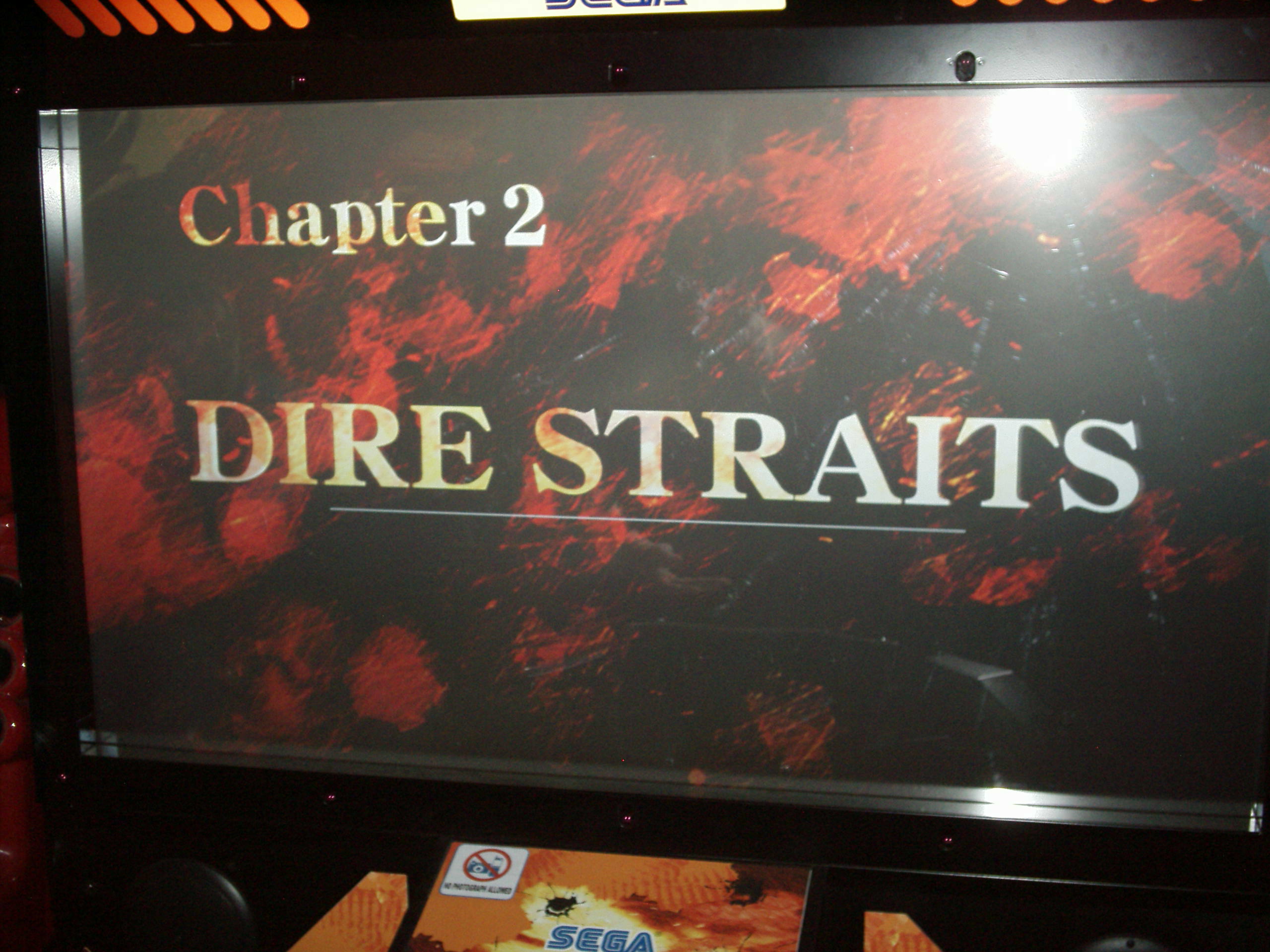 Any gripes? I have a few. Firstly, the game does not seem to significantly alter its difficulty level between one and two player games, which can make the game even more of an uphill struggle for lone players. The only time I genuinely noticed a variation was during the boss battles. Secondly, the graphical performance. While everything has been nicely animated and choreographed, as the video shows, the game doesn’t seem to utilise anti-aliasing, which gives the edges of objects a nasty jagged look. Also, some of the models and textures are a little rough, and on the whole the game doesn’t look as nice as House of the Dead 4, which was released on the Lindbergh board two and a half years ago. Additionally, it occasionally slows down a little when the screen is packed with action, and Overlord noticed that the recoil matches this making it doubly noticeable. Finally, while usually small and nicely disguised, some of the loading delays become just a little bit noticeable when the game stops for a few seconds longer than you’re expecting. However, those issues (and the above one concerning the use of the Ghost Squad gun) may well be rectified before the game officially goes to market.