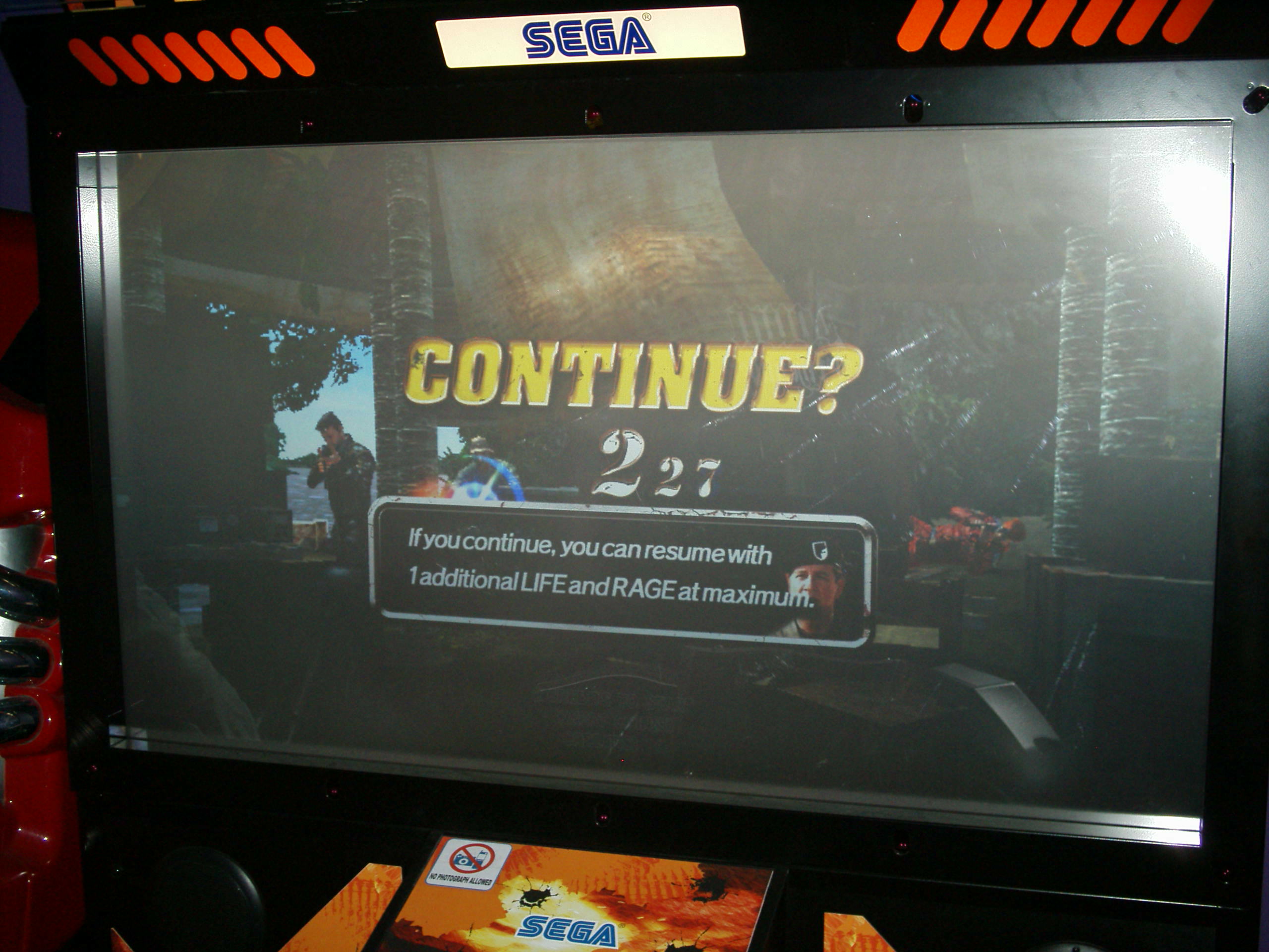 The test itself is an extremely low-key affair, with no publicity at the building and the machine sandwiched between the toilets and a Fast and the Furious Superbikes machine. In fact, there was almost nothing to signify that the machine was out on test. Other than that curious omission, the cabinet is reasonably striking, and bears a heavy resemblance to the cabinet used for Ghost Squad. The main difference is that the screen is now a rather lovely widescreen HD thing, and the cabinet is bathed in an orange glow rather than the green one of the previous game. The gun itself was exactly the same as the Ghost Squad one, which simultaneously fills me with glee and despair. You see, while that gun was well designed it was also quite fragile, and I’ve not seen one which is working properly in quite some time. In Rambo, the majority of situations are solved by pulling the trigger (what a shock!), with the action button triggering “Rambo Mode” and the mode change switch seemingly unused. Reloading is by shooting out of the screen as usual, but I did occasionally find myself pining for the quick reloads of House of the Dead 4‘s shaking system.