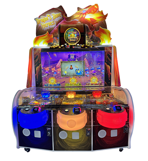 I don’t pay a ton of attention to coin pushers but this Wahlap-made one having a video screen likes to prod me into that direction. Setup for 1-3 players, this fantasy-themed game challenges the player to fire off tokens at the moving target (aka “the loot bag”) to trigger events on the screen and open up ways to win more tickets. The most impressive instance is when the game begins to fire off a constant stream of coins at the loot bag. It comes in a nice looking cabinet too, although the image shows it saying “Dragon’s Bane Heroes” while the product page just says Dragon’s Bane.