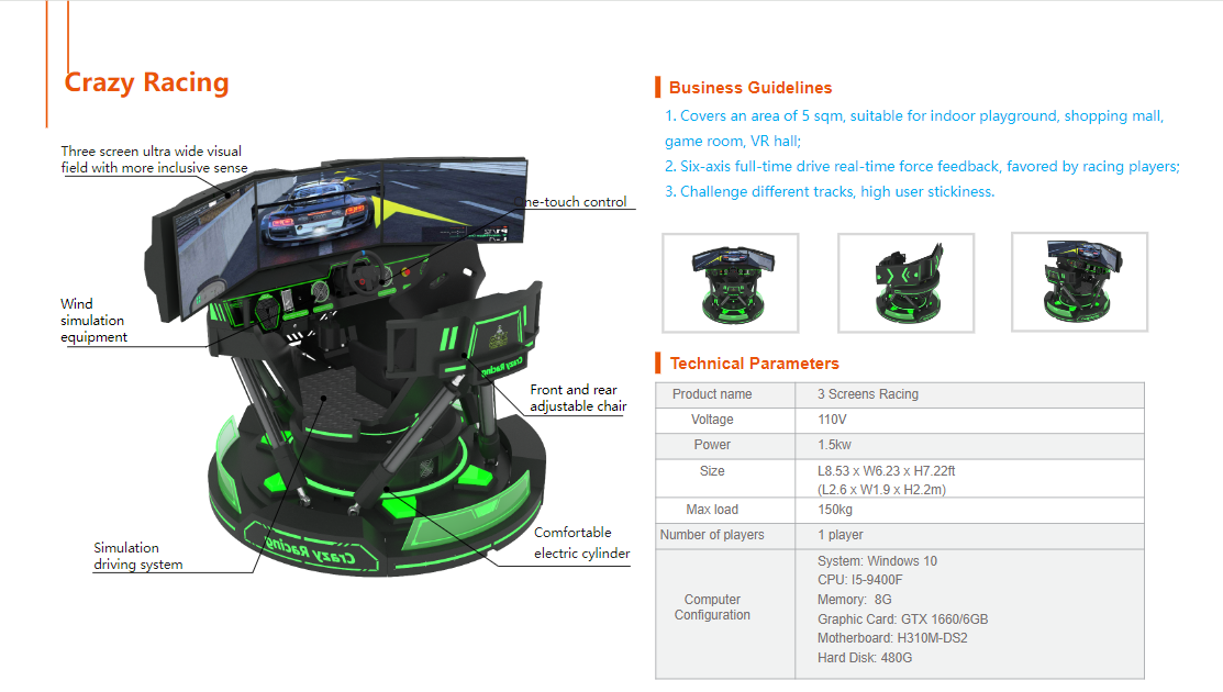 For locations in the market for a new motion racing simulator, VR 360 Action has a solution called Crazy Racing. This is a multi-game, race-focused simulator. Let’s see what it is all about: